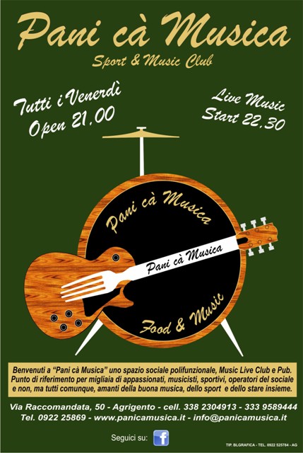 Venerdì 13 Maggio vi aspettiamo al Pani cà Musica con il live degli Angels and Brothers(A&B)COMPONENTI: Angelo basso, Antonio batteria,Antonio chitarra,Emanuele tastiera e chitarra ,angelita voceGENERE: rock/blues/musica italiana/disco musicOpen@21:00– Live@22:30